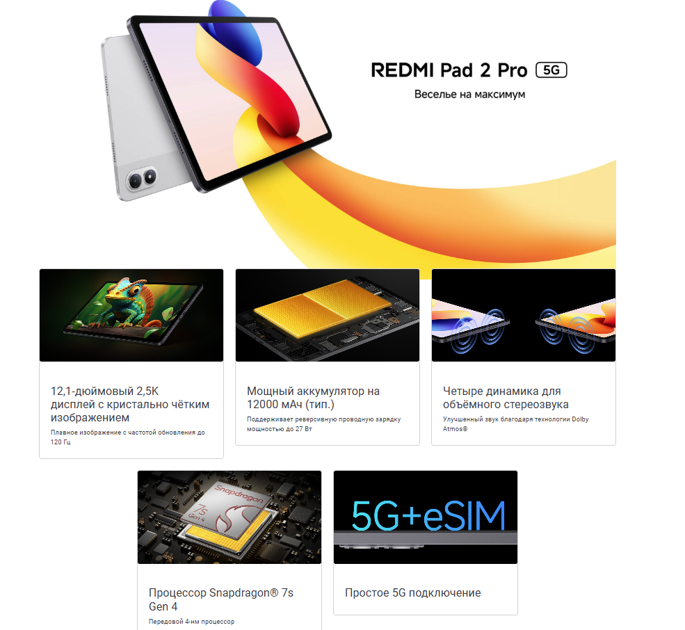 Характеристики Планшет Redmi Pad 2 Pro 5G 8/256GB Gray/Серый
